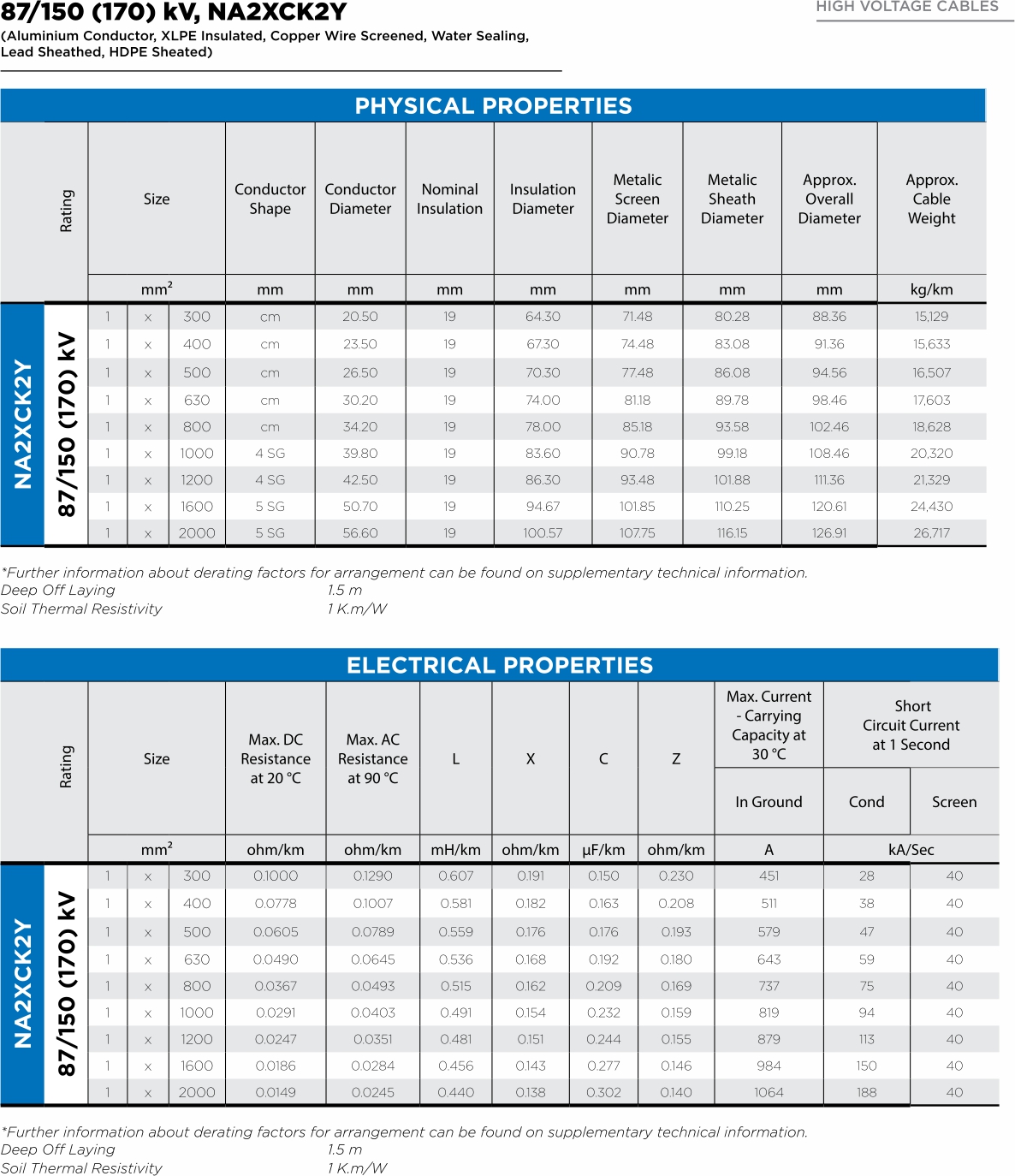 Single core High Voltage Cable, Copper or Alumunium Conductor with rated Voltage of 170 kV, Apllies for underground transmission with power frequency of 50-60 Hz.