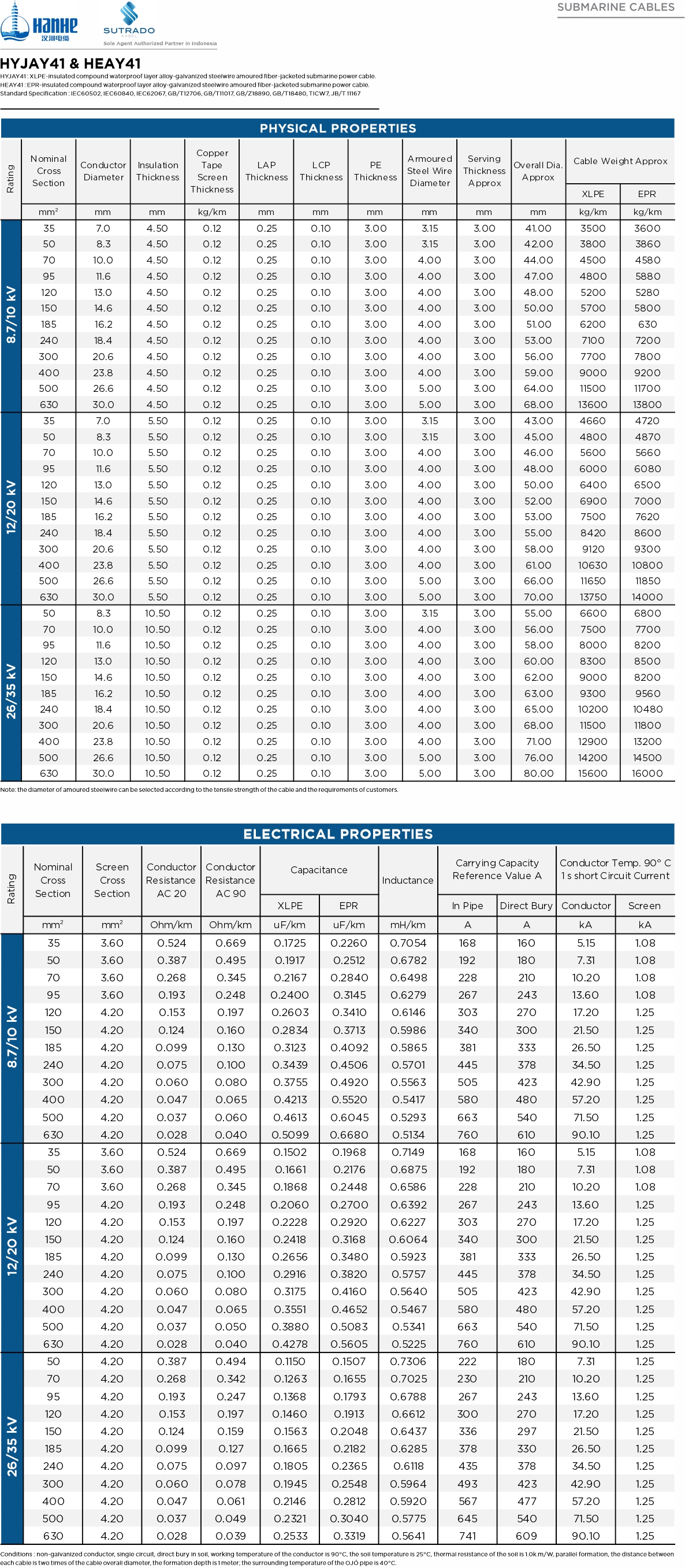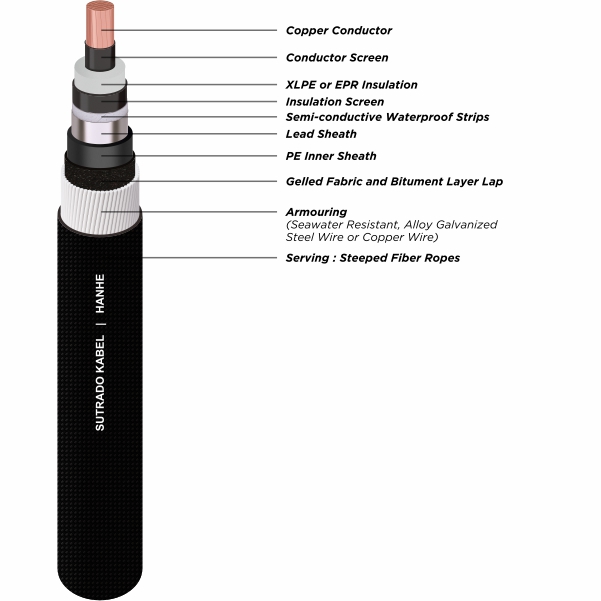 HYJAY41 : XLPE-insulated compound waterproof layer alloy-galvanized steelwire amoured fiber-jacketed submarine power cable.